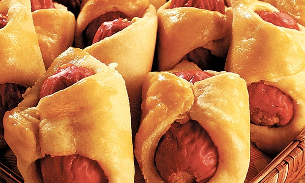 - Ponha uma salsicha fria no centro de cada tira de massa e feche as pontas.