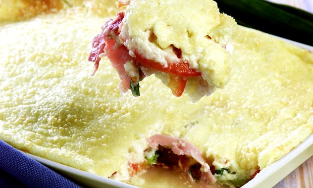 - Sobre ele, faça camadas alternadas de presunto, alho-poró, tomate, mussarela e manjericão.