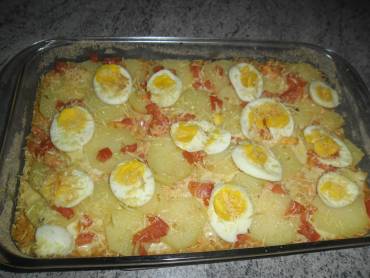 - Colocar no refratário uma camada de arroz cozido, peito de frango e mais uma camada de arroz.