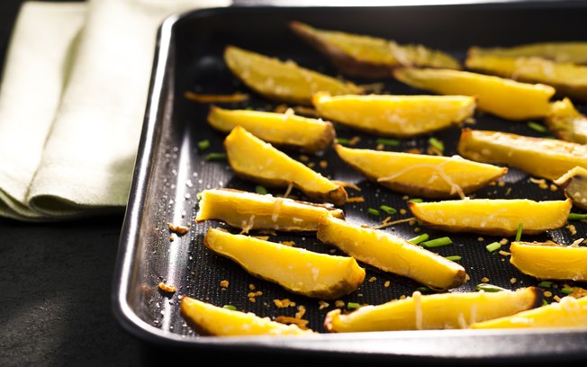 • Retire do forno e com cuidado, corte cada batata ao meio e depois em gomos.