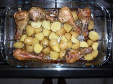 - Retire as coxas de frango do forno e acrescente as batatas pré-cozidas, unte-as com manteiga (ou maionese).