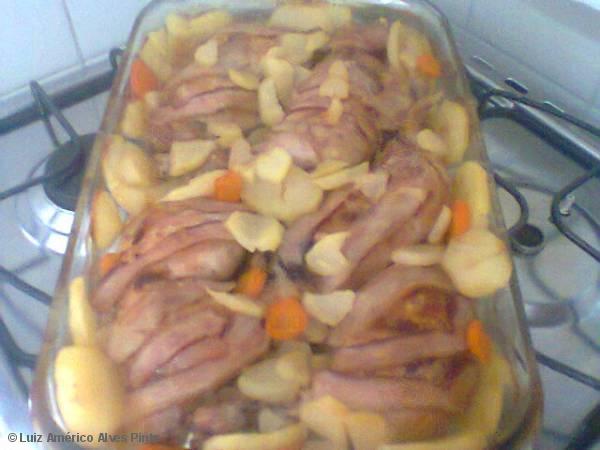 - Acomode entre os pedaços de franco a batata e a cenoura.