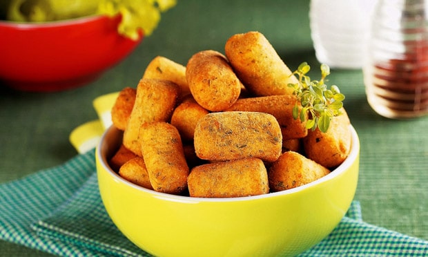 - Passe o croquete na clara e na farinha de rosca e frite em óleo bem quente.