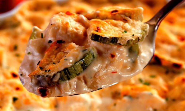 • Em um refratário levemente untado, distribua a abobrinha e o palmito.