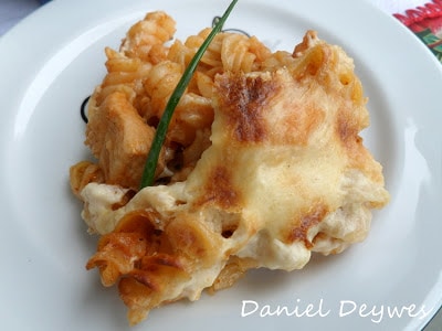 - Coloque o macarrão numa travessa e por cima a mistura de queijo.