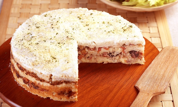 - Em uma fôrma de 30 cm de diâmetro ou num refratário retangular, ponha uma camada de pão e uma camada de recheio, até terminarem os ingredientes, acabando com o pão.