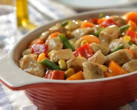 • Junte o peito de frango previamente cortado aos bocados e deixe refogar um pouco.