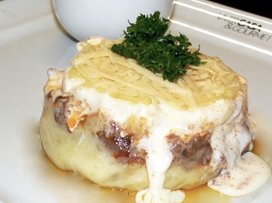 • Para a montagem do escondidinho, pegue um refratário coloque uma camada do creme de macaxeira, o filé-mignon já refogado e cubra com o restante do creme.