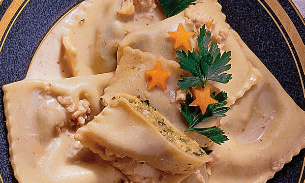 - Junte o parmesão ao molho, cubra os raviólis e sirva.
