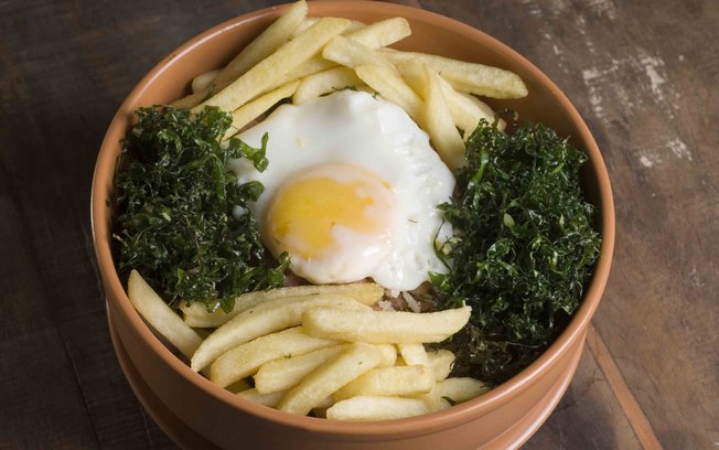 • Disponha o arroz no prato e cubra com ovo e couve e batata frita.