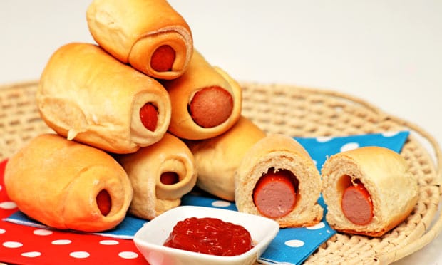 • Divida a massa em 30 partes iguais, abra-as e enrole cada uma em uma metade de salsicha.