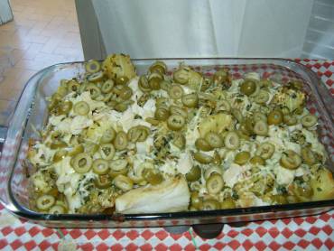 - Retire a fôrma do forno com as batatas e acrescente o bacalhau, depois de demolhado, arrumando-o na fôrma.