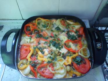 - Quando estiver levemente dourado acrescente o bacalhau desfiado, o tomate picado, azeitonas, os pimentões picados e após alguns minutos acrescente o molho de tomate e por fim os 2 vidros de leite de coco.