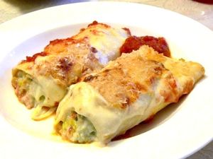 • Em cima dessas fatias, coloque uma porção do frango desfiado, enrole e continue fazendo assim com o resto dos ingredientes (enrolando os canelones).