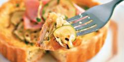 • Retire do forno, desenforme, decore com as rodelas de abobrinha e com as fatias de presunto.