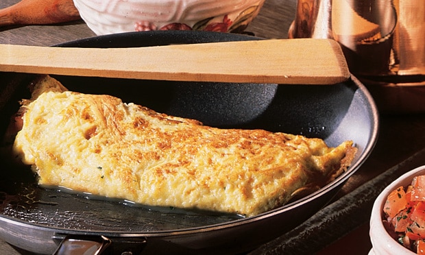 - Quando estiver quase cozida, mas ainda cremosa, coloque 3 colheres (sopa) do recheio na metade da omelete.