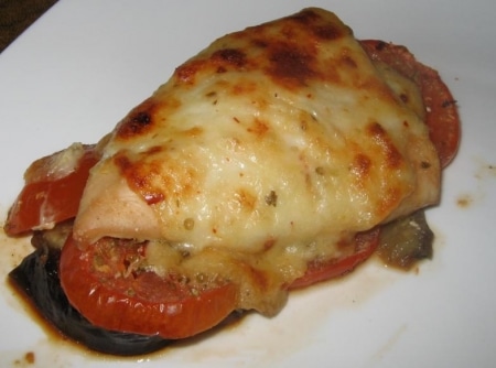 Peito de Frango Assado sobre Berinjela e TomateIngredientes: