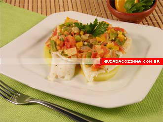- Em um refratário pequeno untado, faça uma camada com as batatas, coloque os filés de peixe e espalhe o refogado por cima dos filés, cubra com papel-alumínio e leve ao forno médio, preaquecido, por 30 minutos.