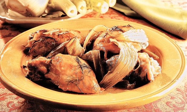 • Corte a erva-doce em pedaços grandes e arrume sobre o frango no fundo da assadeira.