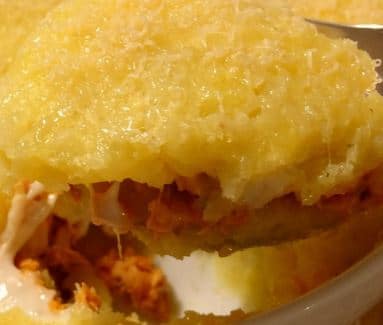 - Intercale em camadas parte do purê, o recheio, o restante do purê e as claras em neve.