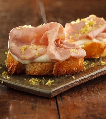 • Retirar do forno, colocar no prato de servir e colocar sobre cada bruschetta uma fatia de mortadela e raspas de limão-siciliano.