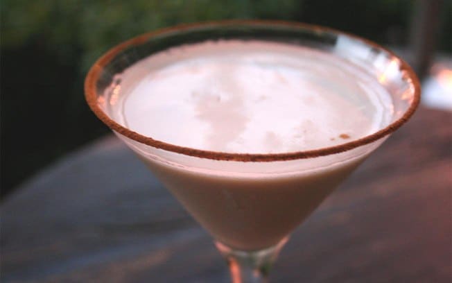 • Misture o conhaque, o licor de chocolate, o creme de leite e 8 pedras de gelo em uma coqueteleira.