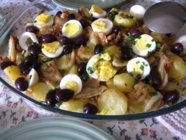 - Coloque numa travessa e enfeite com rodelas dos ovos cozidos, as azeitonas e as alcaparras.