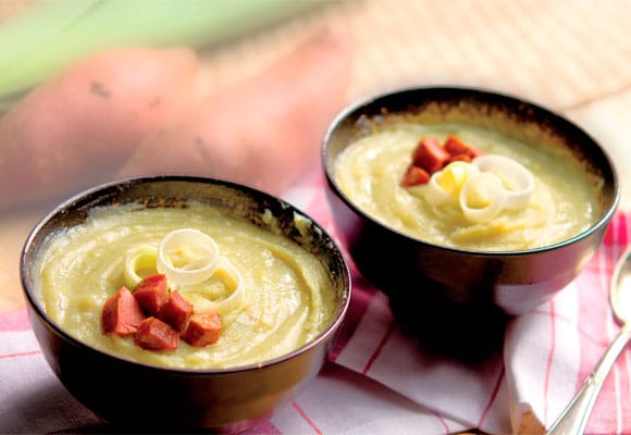 • Depois disso, bata no liquidificador as batatas com a água do cozimento e volte o creme formado à panela, colocando o alho-poró picado.