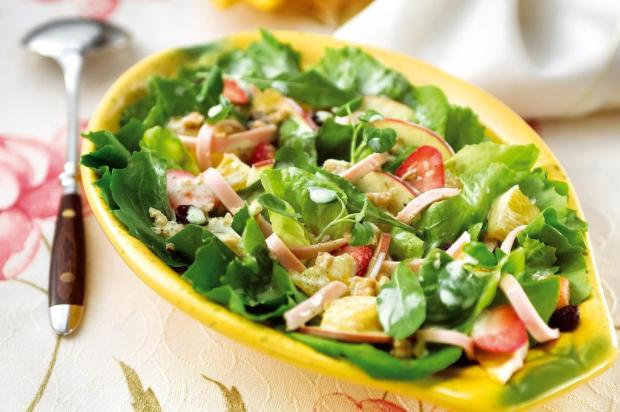 • Em uma saladeira, distribua o peito de peru, as folhas verdes, as maçãs, as laranjas, os morangos, as nozes e as uvas.