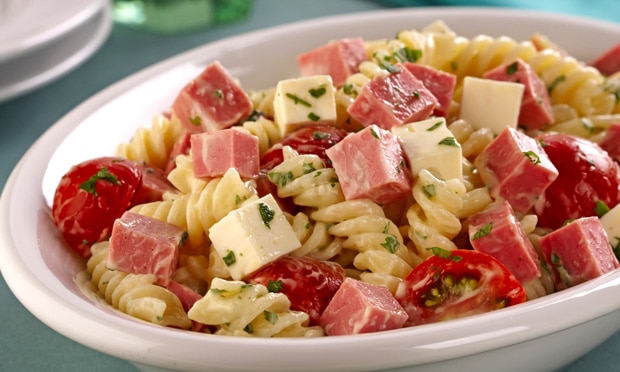 • Em uma saladeira, misture o macarrão, a mortadela, o queijo e o tomate.
