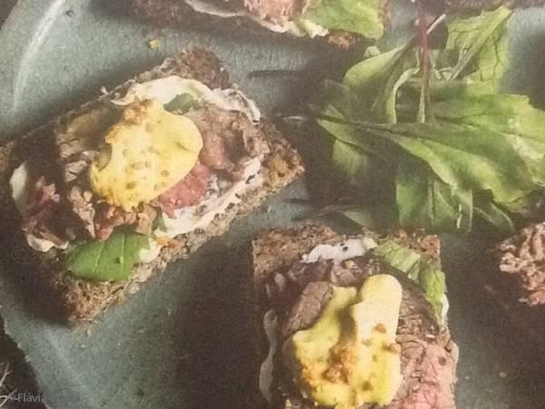• Fatie a carne e monte os sanduíches com uma fatia de pão, maionese, folhas de agrião e rúcula, fatias de rosbife e mostarda Dijon.
