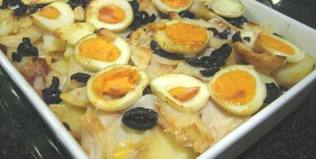 - Colocar em refratário untado com azeite, uma camada de batatas, bacalhau desfiado a gosto e o estrugido. (Repetir se quiser).