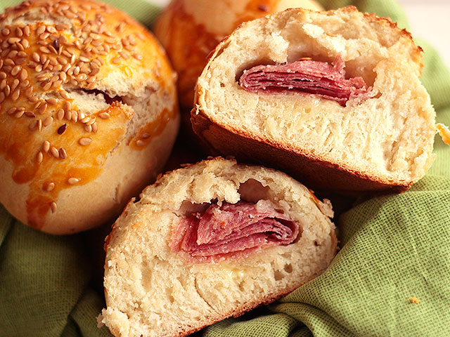 - Abra a bolinha na palma da mão em coloque duas fatias de salame e um quadrado de queijo em cada uma.