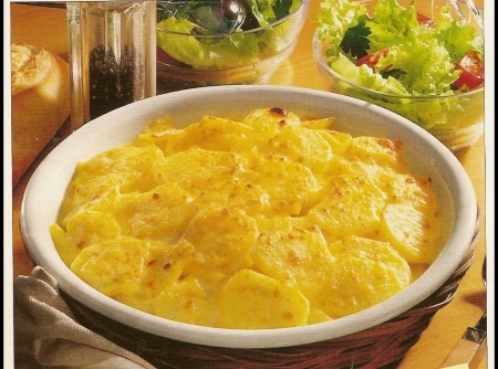 • Ponha as batatas e o creme de leite em uma travessa pincelada com manteiga, cubra com queijo ralado e pedaços de manteiga e leve ao forno 210ºC até as batatas ficarem cozidas.