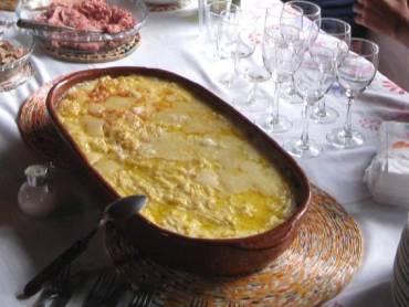 • Rale a mussarela e misture com o creme de leite, em seguida ponha por cima do bacalhau, cobrindo bem.