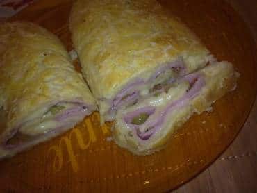 • Enrole como rocambole, pincele com uma gema de ovo, e coloque pra assar em forno quente, por mais ou menos 30 minutos.