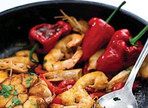 - Limpe a cabeça de alho e ponha-a em uma frigideira grande com as pimentas vermelhas partidas, os pimentões cortados em tirinhas e o azeite.