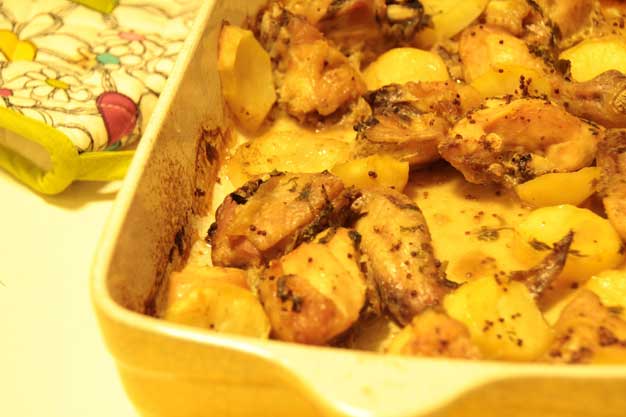 - Num tabuleiro que vá ao forno e à mesa coloque o frango em pedaços e as batatas em rodelas.