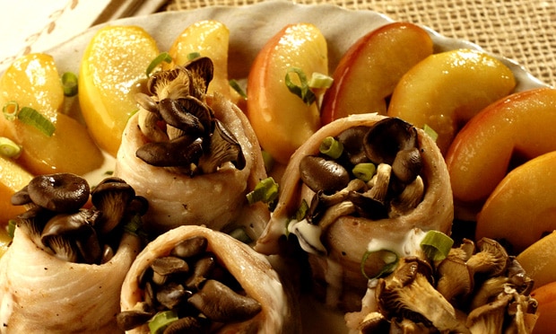 - Limpe os cogumelos e distribua-os sobre os filés, enrole-os como um rocambole e espete com um palito. Reserve.