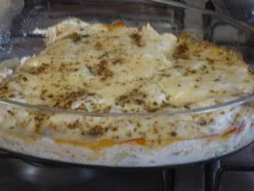 - Colocar em um refratário as batatas, depois o frango desfiado e cubra com a caixa de creme de leite, finalize com as fatias de mussarela e um pouquinho de orégano.
