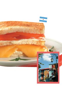• Monte o sanduíche: faça camadas de pão, maionese, queijo, pão, tomate temperado com o sal e pão.