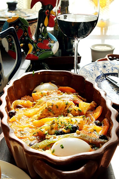 - Retire do forno e finalize com as azeitonas, o pimentão, os ovos e o alho frito.