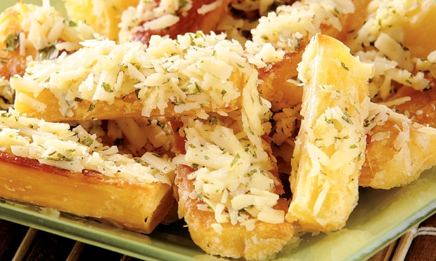 • Escorra a água, coloque a mandioca em uma assadeira untada com margarina e leve ao forno preaquecido até dourar.