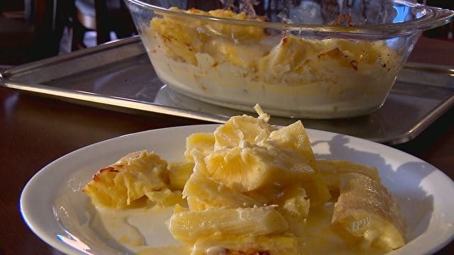 • Junte o restante da mandioca, acrescente o queijo restante e regue tudo com o leite.