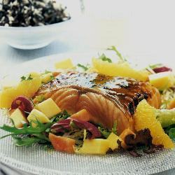 - Coloque o salmão cozido por cima da salada e, com uma colher, espalhe a marinada já quente.