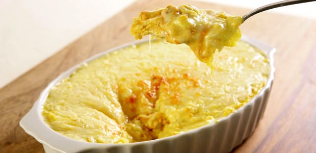 • Em um refratário untado, faça uma camada com metade do creme de milho, distribua sobre ela o frango cozido e desfiado, cubra com o restante do creme de milho.
