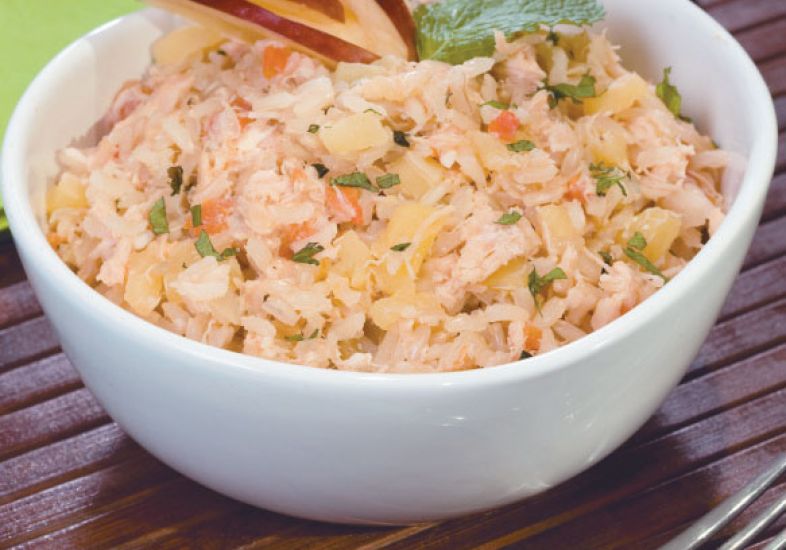 - Junte o arroz, os tomates, o frango, a maçã, o sal e a pimenta-do-reino.