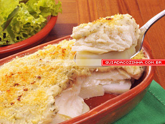 • Em um refratário grande distribua as batatas e o bacalhau.