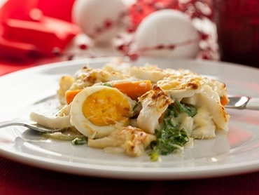 - Acrescente os legumes, as rodelas de ovo, o bacalhau, o molho e por fim o queijo ralado.