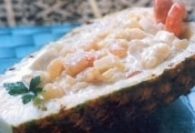 - Recheie as cascas de abacaxi com a mistura de camarão, dissolva a farinha de trigo restante no leite de coco reservado, pincele a superfície do recheio, polvilhe com farinha de rosca, leve ao forno e deixe gratinar.